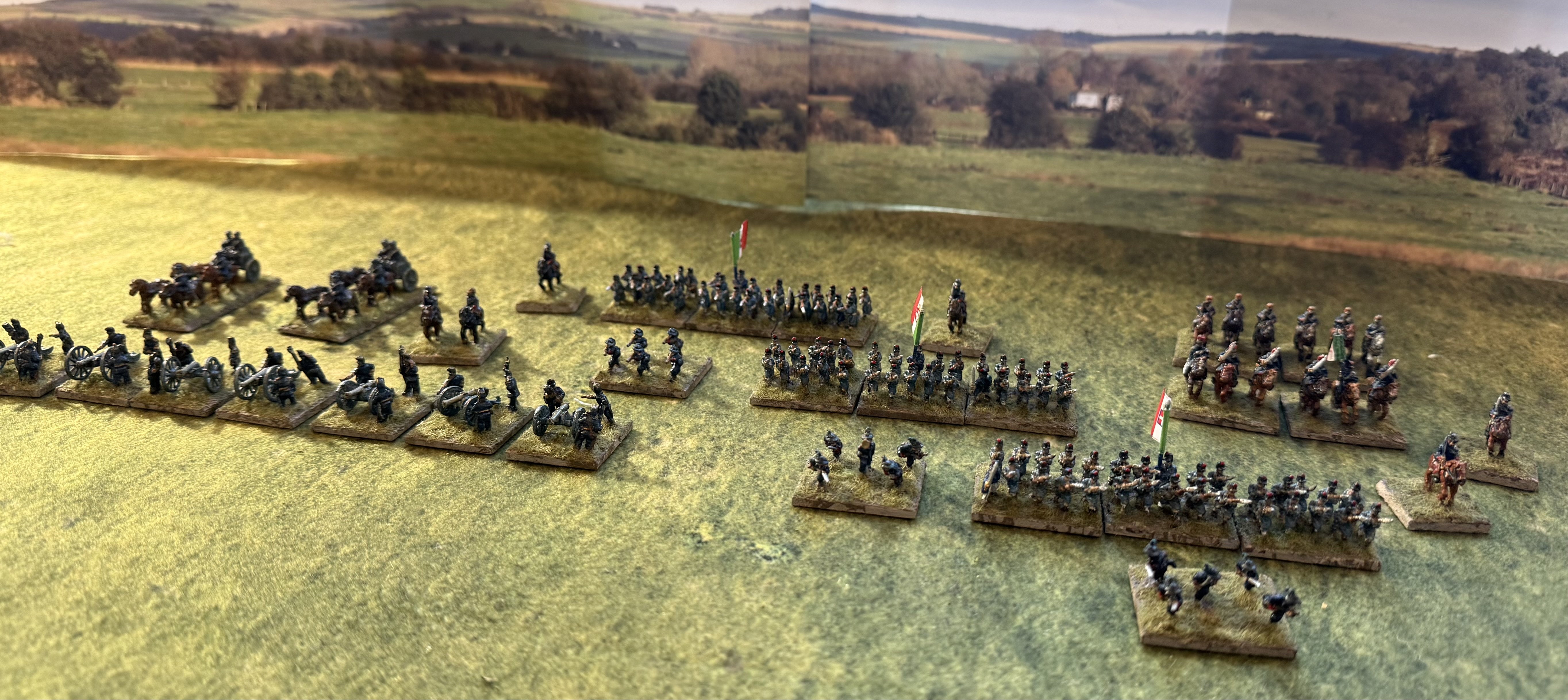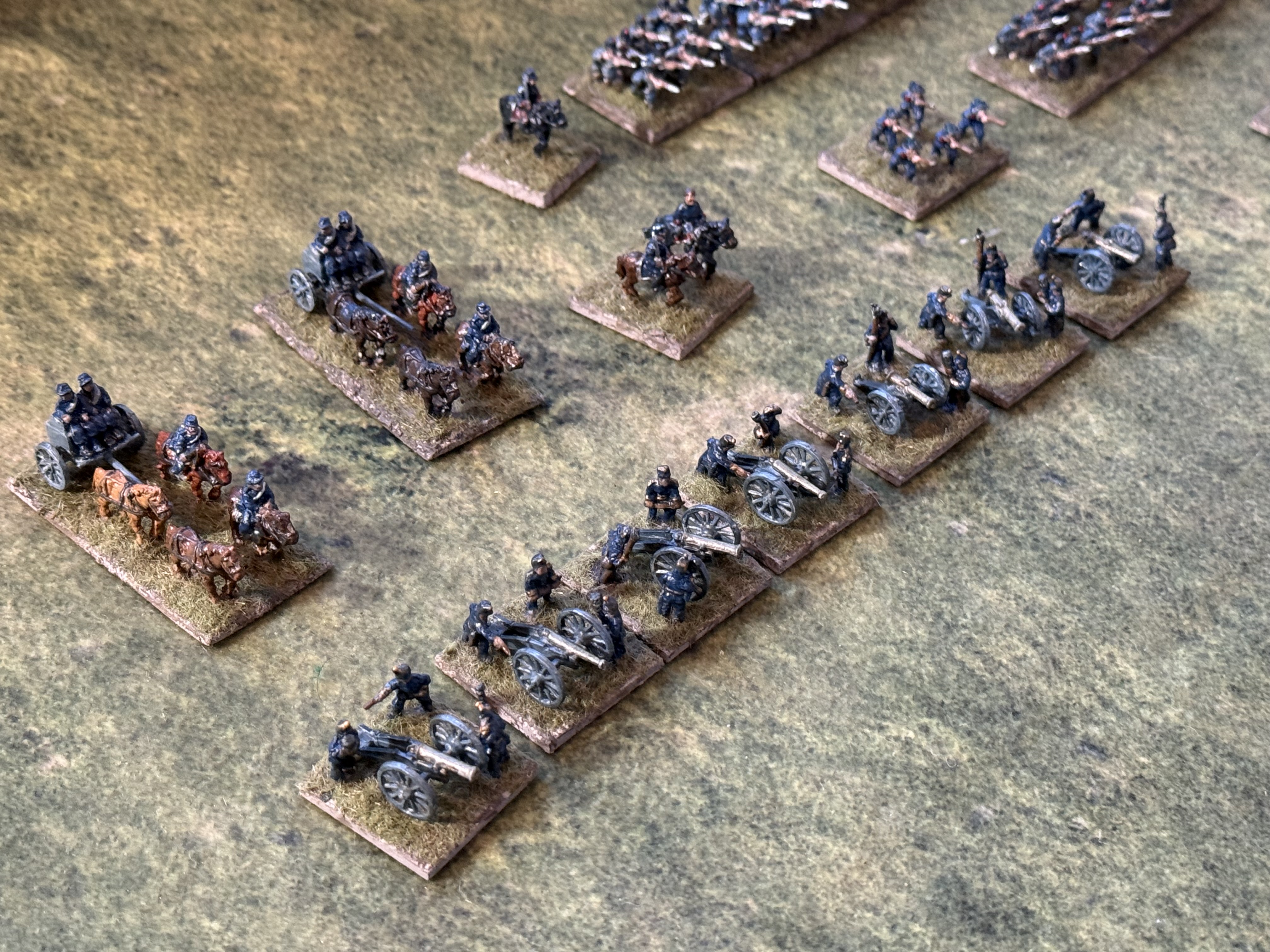 This relatively modest batch has taken me months of elapsed time as I have not been able to spend much time in the studio across October to Christmas. There are nine bases of line infantry, three of Bersaglieri , four of cavalry, a more impressive seven of artillery, plus two limbers and five generals.