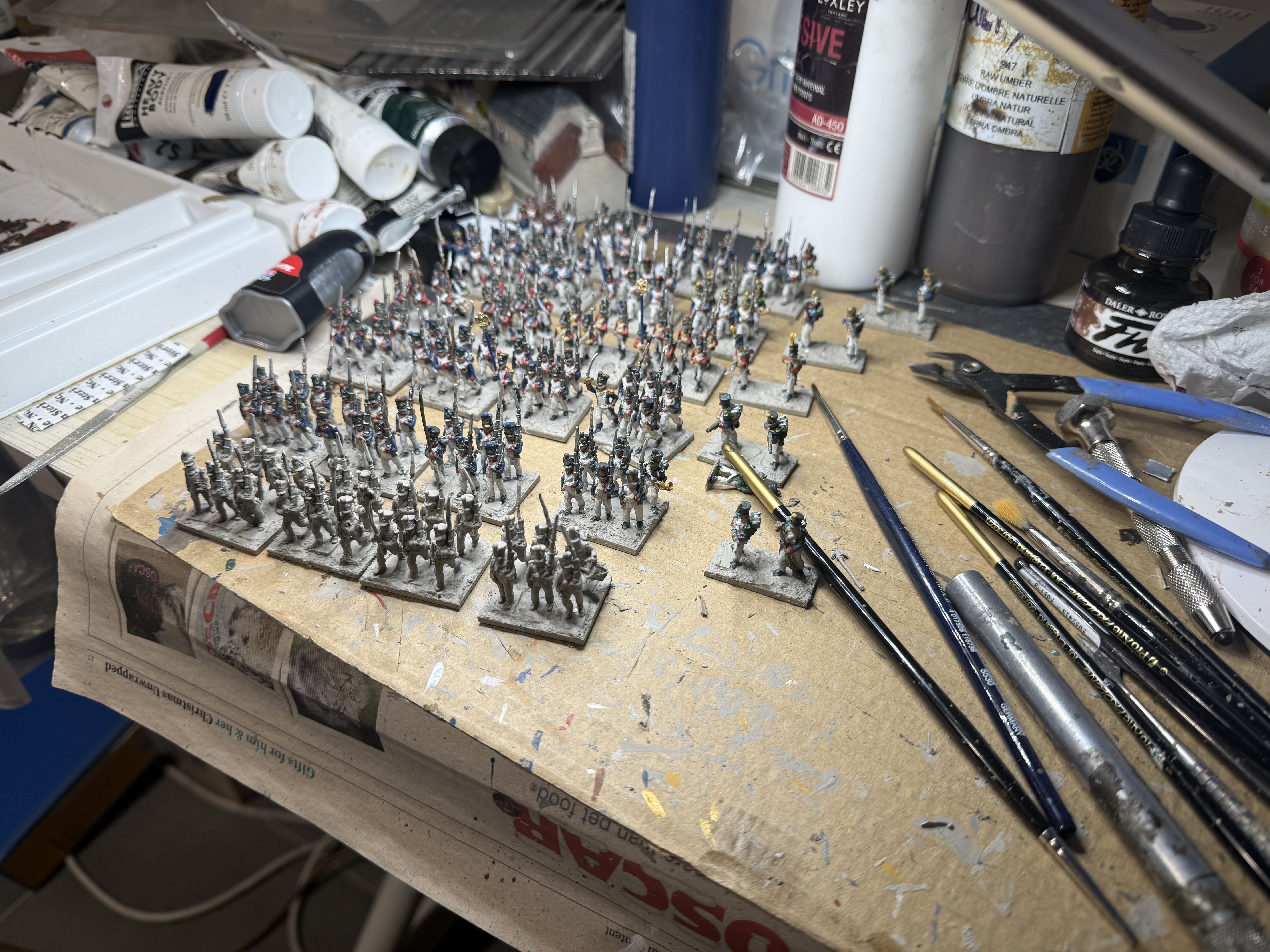 The picture shows where I’ve got to: five of the six battalions are ready for finishing (bases and a wash). The remaining battalion will take another couple of sessions to do – so I’m on track!