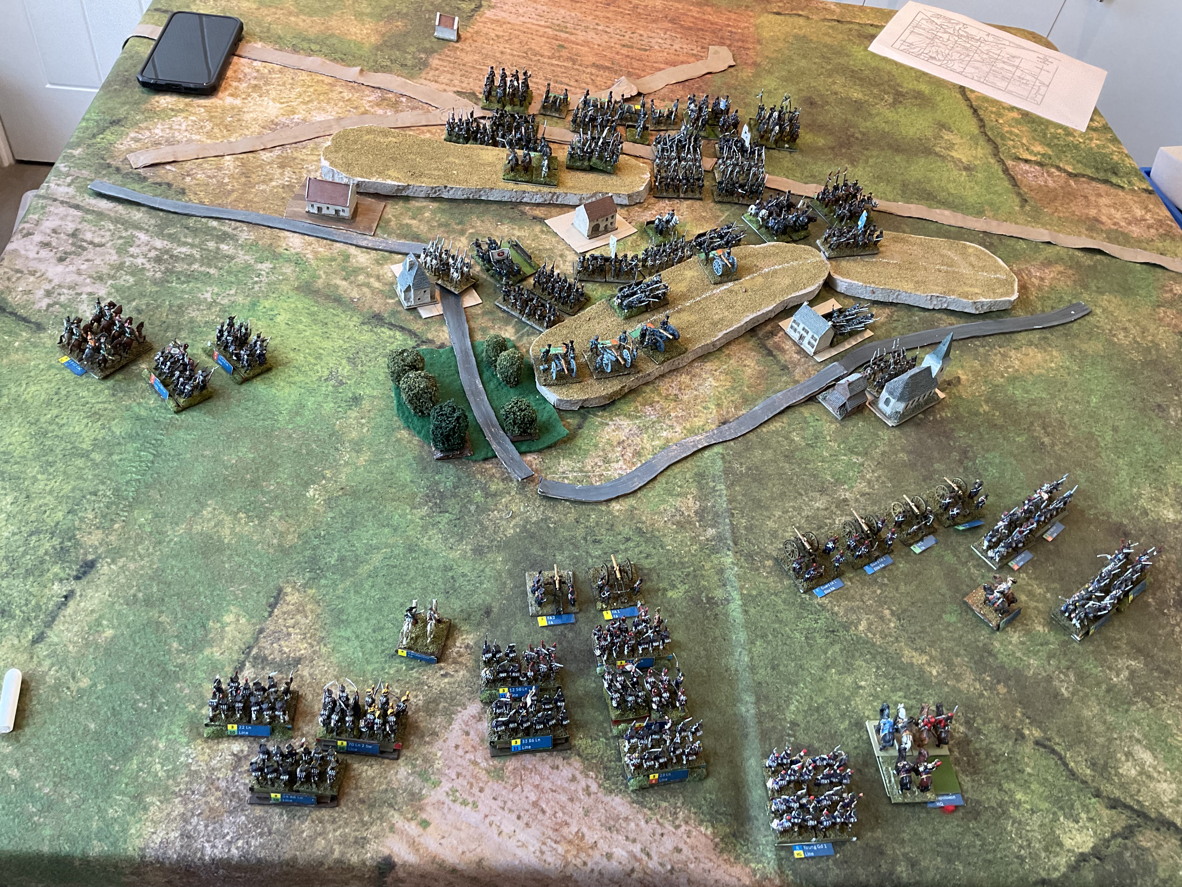 Still, Ligny (two days before Waterloo in 1815) is an enduring fascination of mine. I want to do a full version of it using my own rules – and a “big Ligny” too, incorporating Quatre Bras. It is a very demanding test of a grand tactical rules system. To date I have tried Blücher and my own adaptation of Bloody Big Battles; both failed – the French didn’t stand a chance. There are two big challenges: fighting in the villages, and Prussian command and control, where the two and eventually three corps became intermingled, and where the (division-sized) Brigades were sometimes broken into pieces ad-hoc. How would HFG do?